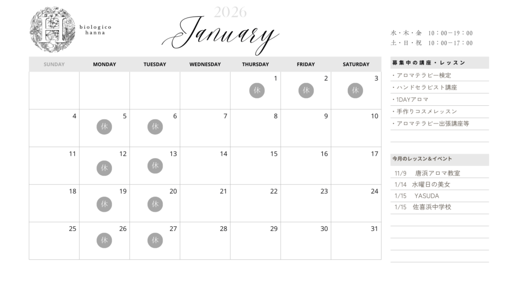 HOME > スケジュール > 1月のカレンダー 2026年1月7日 1月のスケジュールはこちら! ___________ 募集中の講座・レッスン  ̄ ̄ ̄ ̄ ̄ ̄ ̄ ̄ ̄ ̄ ̄ ■アロマテラピー検定 ■ハンドセラピスト講座 ■1DAYアロマ ■手作りコスメレッスン 今月もどうぞよろしくお願い致します。 多少の変更ございますので、インスタ等でもチェックしてください! インスタはこちら↓↓